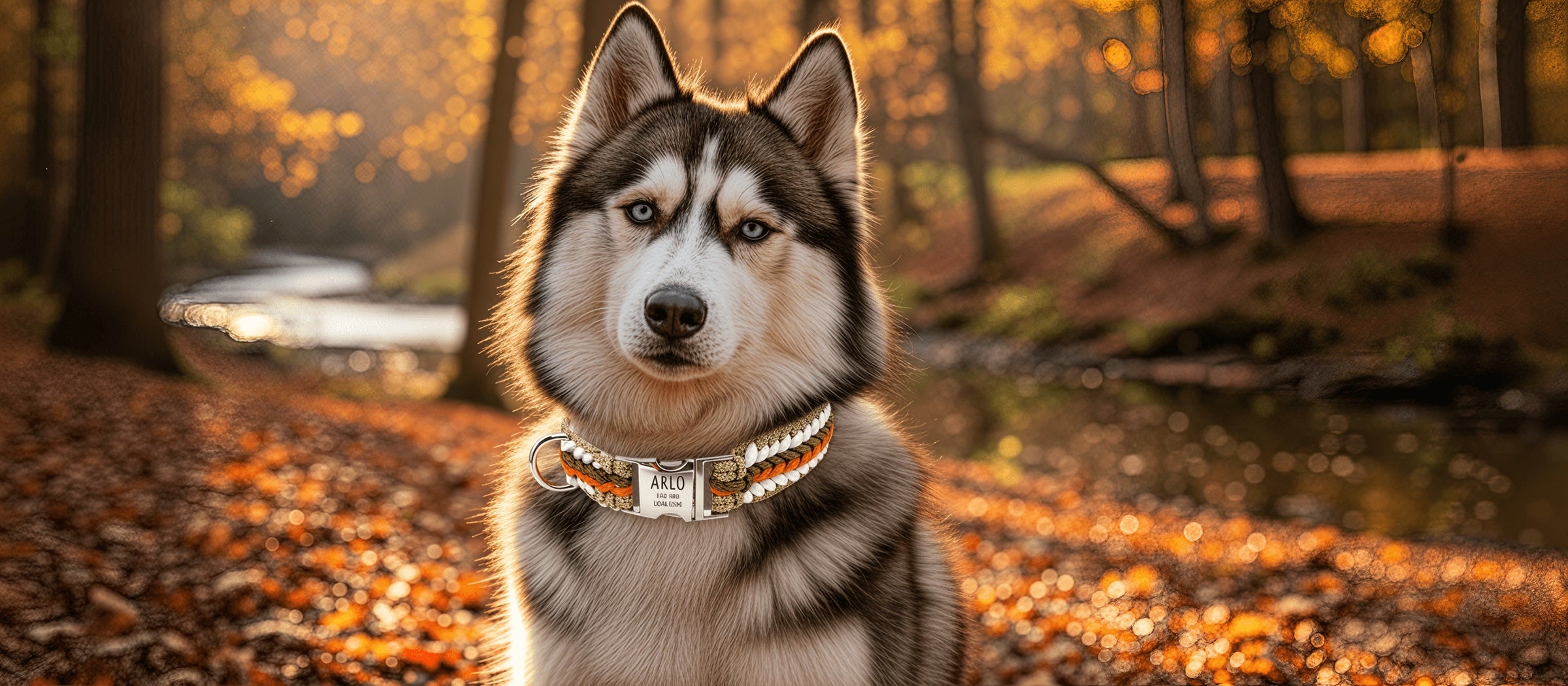 Arlo – Handgefertigtes Paracord Hundehalsband mit Gravur | Orange-Braun-Weiß-Beige