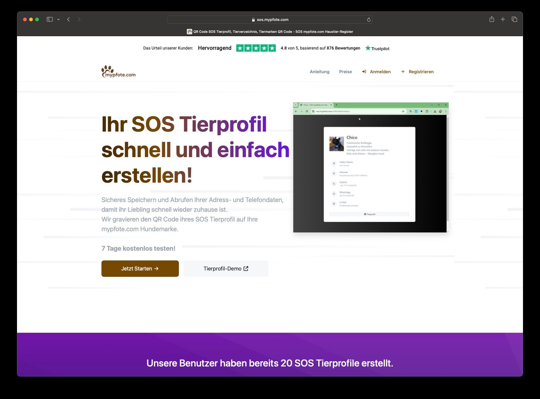 Seit August 2024 bieten wir mit unserem SOS Service eine völlig neue Dienstleistung an. Bringt Eure Hundemarke mit ausführlichem Profil Eures Liebling Online. Es kostet nicht viel und ihr könnt eure Informationen wie Adressen und Telefonnummern immer online ändern und die Tiermarken bleiben aktuell!Mehr Informationzum SOS Verzeichnis