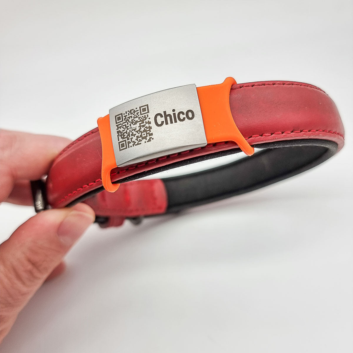 Klapperfreie Hundemarke Silikonslider mit Edelstahl-Schild für Halsbänder inkl. GRATIS Gravur