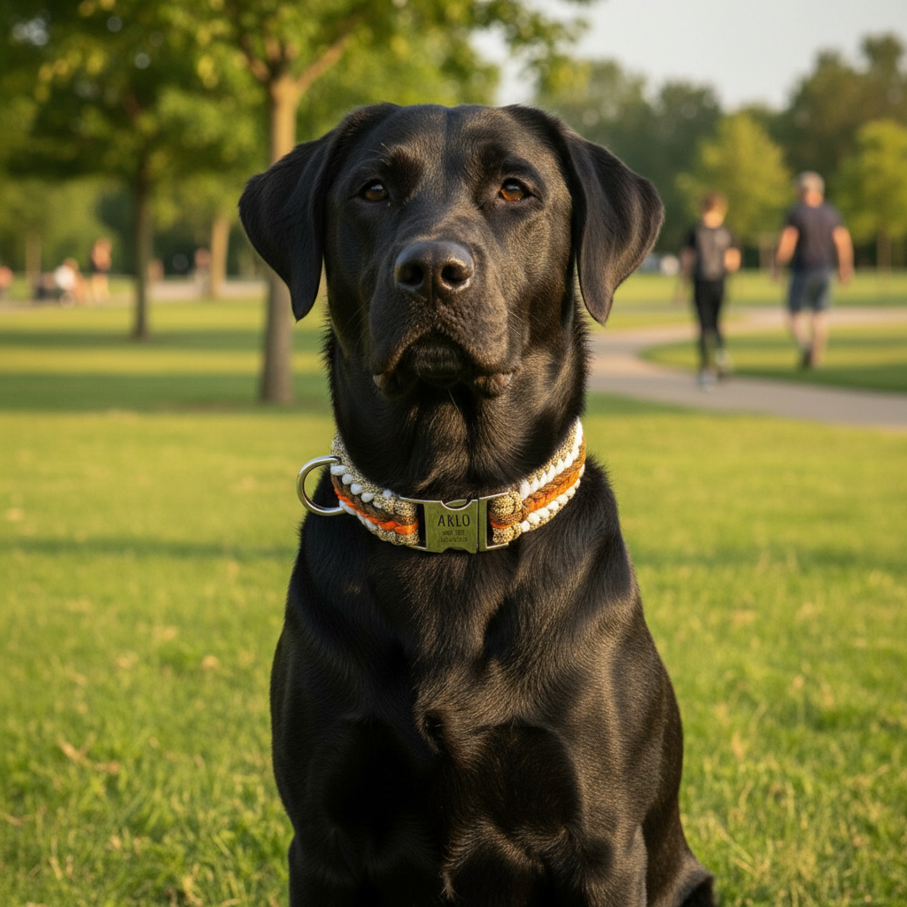 Hurra — hier kommt Arlo! 🎉 Ein lebendiges, robustes und liebevoll handgeknüpftes Paracord-Halsband, das sofort ins Auge fällt. Gefertigt aus 6 Paracord-Schnüren in den Farben Orange, Braun, Weiß & Beige, bietet Arlo Stil, Komfort und Sicherheit für jeden Spaziergang.