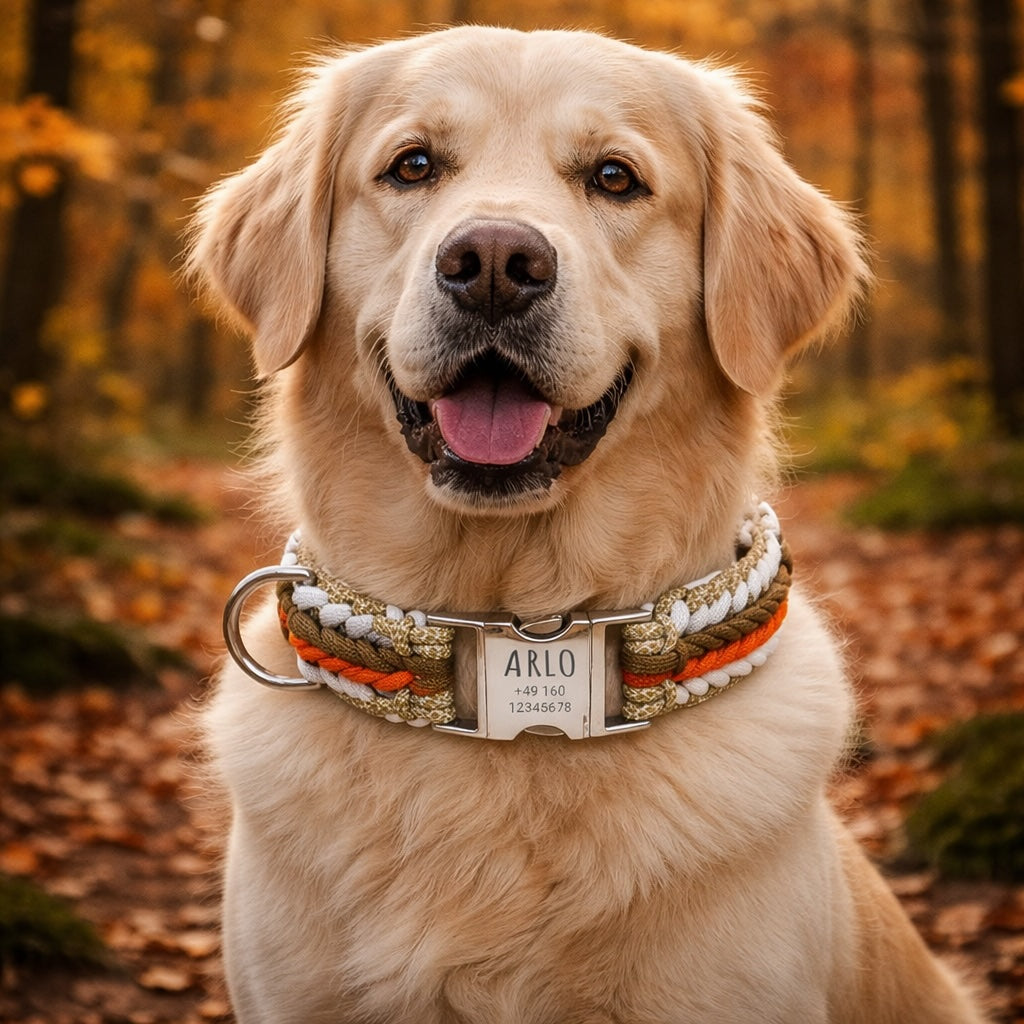 Arlo – Handgefertigtes Paracord Hundehalsband mit Gravur | Orange-Braun-Weiß-Beige
